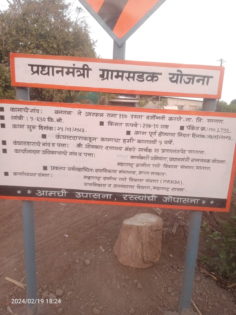 वनगळ-आरफळ तालुका सातारा रस्त्याचे काम चालू असलेल्या ठिकाणी संबंधित ठेकेदाराचा फलक लावलेला आहे त्यामध्ये कंत्राट दाराचे नाव ओमकार दत्तात्रय भंडारे सार्थक 39 प्रतापगंज पेठ सातारा अशी असून कार्यान्वय अधिकाऱ्यांचे नाव कार्यकारी अभियंता प्रधानमंत्री ग्रामसडक योजना महाराष्ट्र ग्रामीण रस्ते विकास यंत्रणा सातारा असे आहे सदरचे काम अतिशय निकृष्ट दर्जाचे चाललेले असून सुद्धा बांधकाम विभागाचे अधिकारी गांधारीची भूमिका का घेतात हाही प्रश्न निर्माण झालेला आहे तरी संबंधित ठेकेदाराला चांगल्या दर्जाचे काम करण्यासाठी सार्वजनिक बांधकाम विभागाचे अधिकारी यांनी स्वतः याकडे लक्ष घालने गरजेचे आहे असेही सर्वसामान्य जनतेमधून बोलले जात आहे.